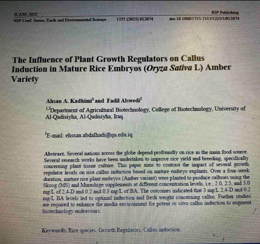نشر التدريسيان في كلية التقانات الاحيائية جامعة القادسية م.د احسان عبد الهادي كاظم بالمشاركة مع ا. م.د فاضل غازي السويدي بحثا بعنوان (Using Ion Beam Irradiation to Evaluate the Morphological and Chemical Characteristics of Jasmine Cultivar Rice (Oryza Sativa L.) Under Drought Condition في مجلة International Journal of Environmental Sciences المصنفة ضمن مستوعبات سكوبس