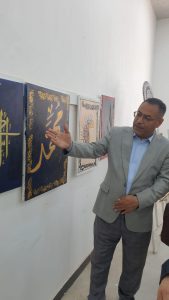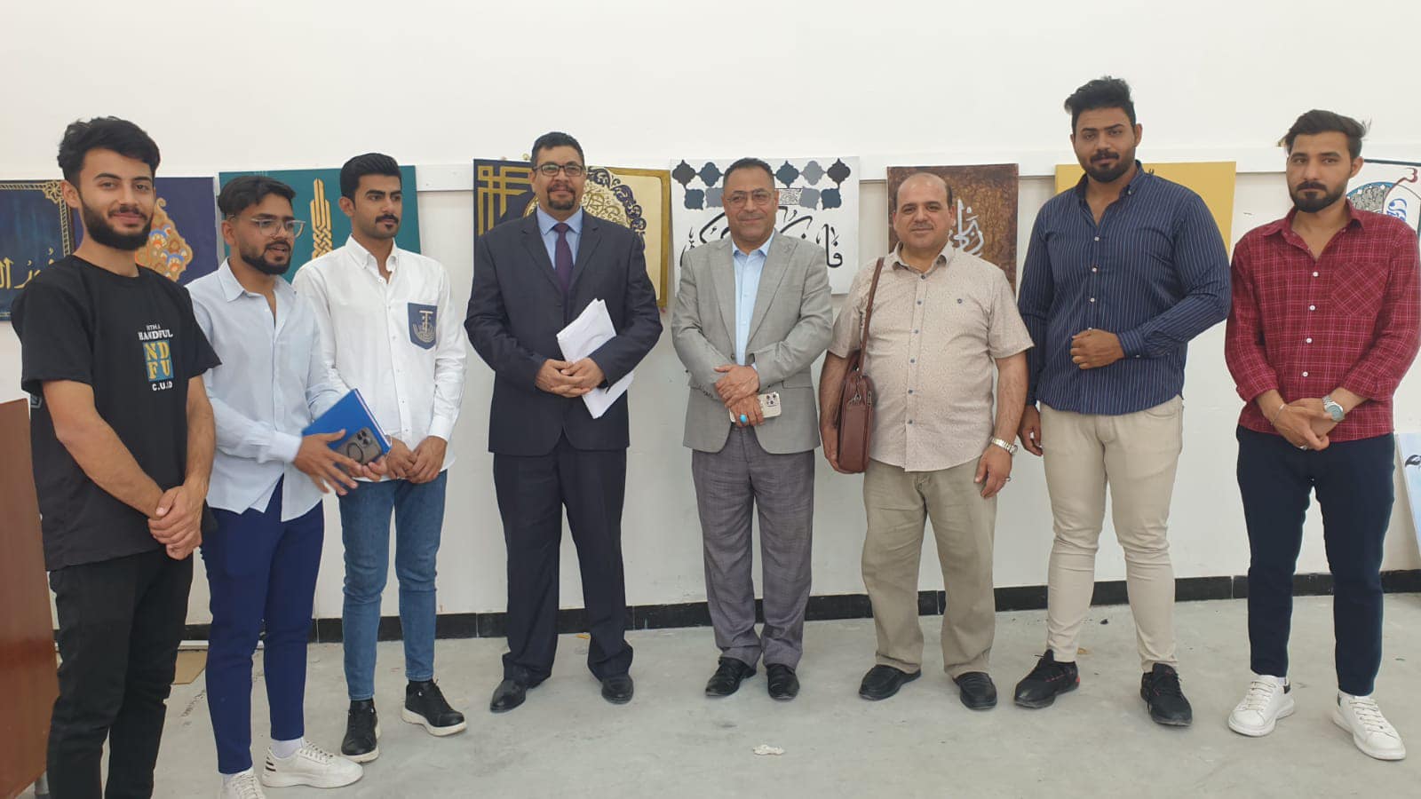 برعاية السيد رئيس جامعة القادسية الاستاذ الدكتور كاظم جبر الجبوري وبحضور السيد عميد كلية الفنون الجميلة الاستاذ الدكتور كاظم نوير الزبيدي اقيم في قاعة المرسم بقسم التربية الفنية معرضا فنيا مشتركا للخط العربي والزخرفة الاسلامية لطلبة المرحلة الثالثة الصباحي وبإشراف تدريسي المادة الاستاذ المساعد الدكتور حسن هادي الغزالي الذي استعرض خلال افتتاح المعرض مجموعة اللوحات الفنية وتقديمه مع طلبته شرح وافي عن اهم ماتضمنته مواضيع اللوحات التي خطتها ورسمتها انامل الطلبة بجمال الخط العربي وانواعه المتعددة الجميلة والتي تزينت برونق وجمال الزخرفة العربية الاسلامية وعملية المزج بين التشكيل الفني والخط العربي الاسلامي في تكوينات فنية جميلة.