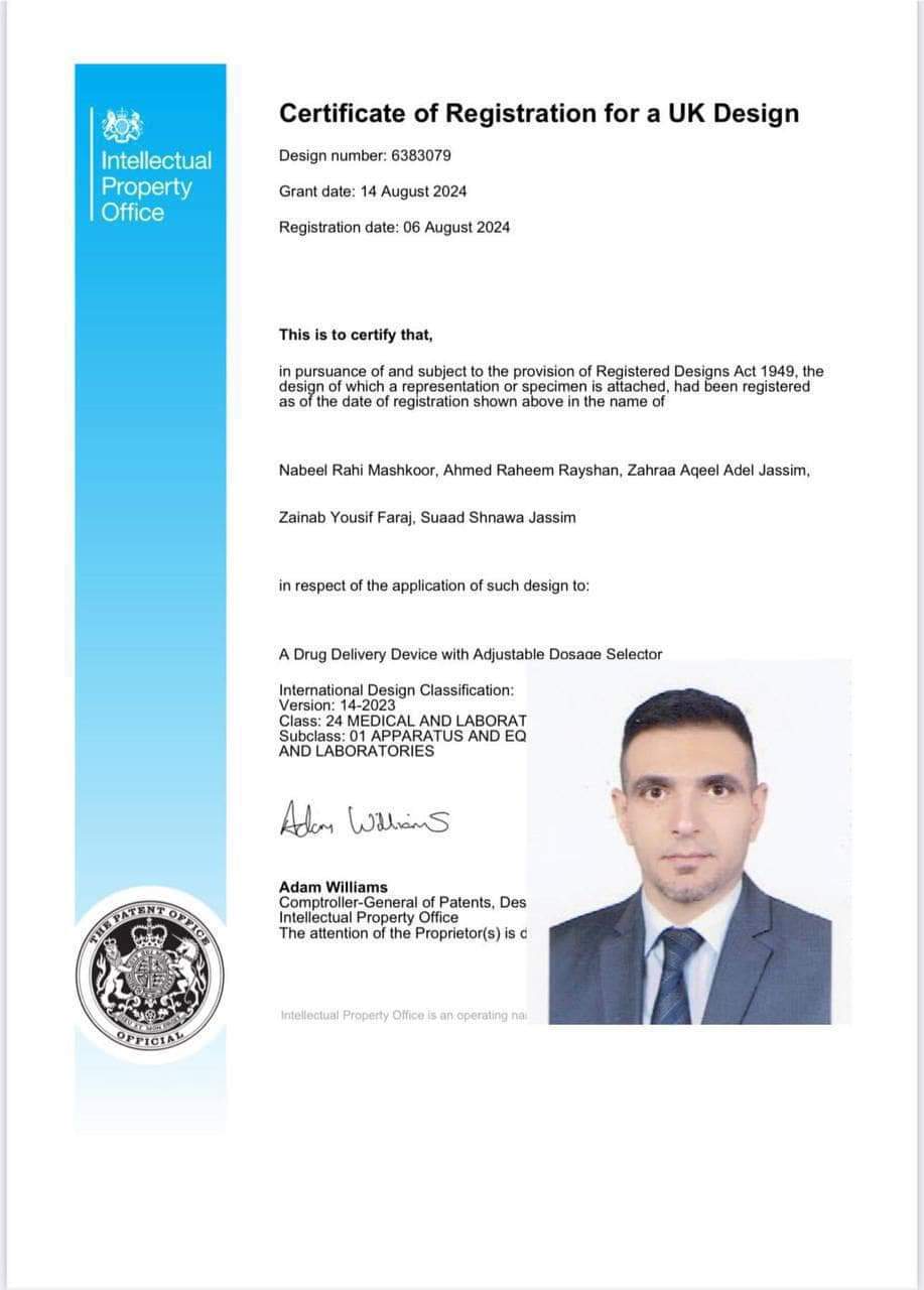 حصل المدرس المساعد احمد رحيم ريشان التدريسي في كلية الطب البيطري بجامعة القادسية وبالاشتراك مع المدرس المساعد نبيل راهي مشكور التدريسي في كلية العلوم على براءة عن تصميم جهاز ” A Drug Delivery Device with Adjustable Dosage Selectorوتندرج ضمن تصنيف التصميم الدولي الإصدار 14-2023 وهي ضمن الفئة: 24 المعدات الطبية والمختبرية، فئة فرعية: 01 أجهزة ومعدات للأطباء والمستشفيات والمختبرات حيث تكمن الفكرة في ان الجهاز مصمم بتوصيل للدواء في اوقات مع تحديد الجرعة القابلة للتعديل حسب ارشادات الطبية الموصوفة