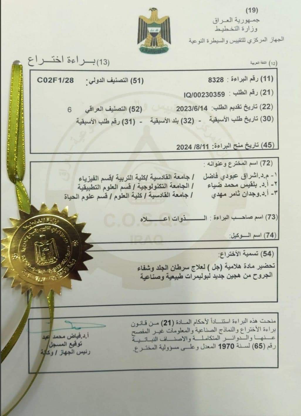 حصلت المدرس الدكتورة إشراق عبودي فاضل التدريسية في قسم الفيزياء بكلية التربية جامعة القادسية و المدرس الدكتورة وجدان ثامر مهدي في كلية العلوم على براءة اختراع لمشاركتهما في تصنيع (مرهم يستخدم لشفاء الجروح ومعالجة سرطان الجلد) اذ حصلت الباحثات على براءة الاختراع من (وزارة التخطيط / الجهاز المركزي للتقييس والسيطرة والنوعية )تضمنت براءة الاختراع تحضير الجل من مواد بوليمرية قابلة للتحلل البايلوجي ومدعمة باكاسيد نانوية لمعادن التيتانيوم والمغنيسيوم والزنك كذلك تطبيق المنتج على نسيج حي لفئران مختبرية حيث تم احداث شق على الجلد ومعالجتها بالجل وكانت مرحلة الشفاء التام واندمال اثر الجرح خلال اسبوع فقط) وكذلك اثبتت الفحوصات النسيجية و Cell Line كفاءة المنتج في محاربة خلايا الجلد السرطانية