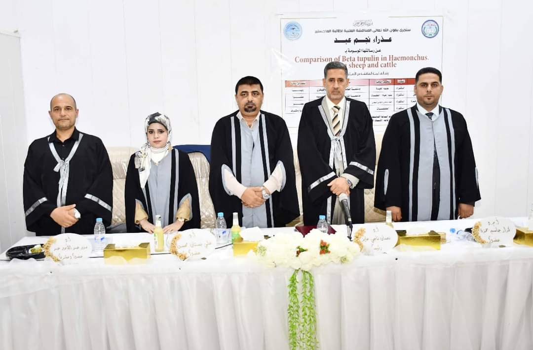 نوقشت رسالة الماجستير في كلية الطب البيطري بجامعة القادسية الموسومة بـ (مقارنة البيتا تيوبيولين لطفيلي الديدان السلكية في الاغنام والابقار) للطالبة عذراء نجم عبد مروة الربيعي وبإشراف ا.د. منير عبد الامير الفتلاوي